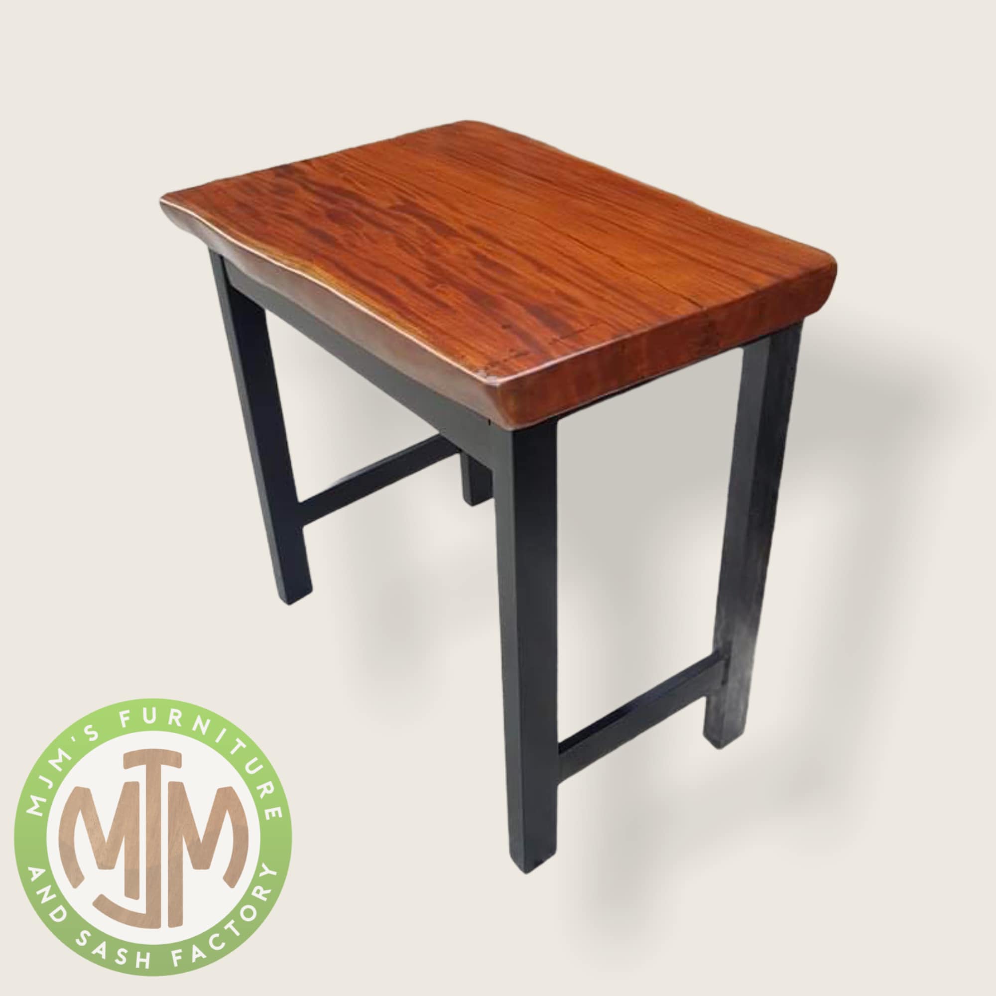 Add a touch of rustic charm and functional versatility to your home with this Artisan Wood Accent Stool. The stool features a uniquely shaped seat with a striking, highly figured natural wood grain top in a warm, reddish-orange tone that retains an appealing live-edge aesthetic. This eye-catching top rests upon a sturdy, contrasting dark or black base and legs, providing stability and a modern edge to the organic design.