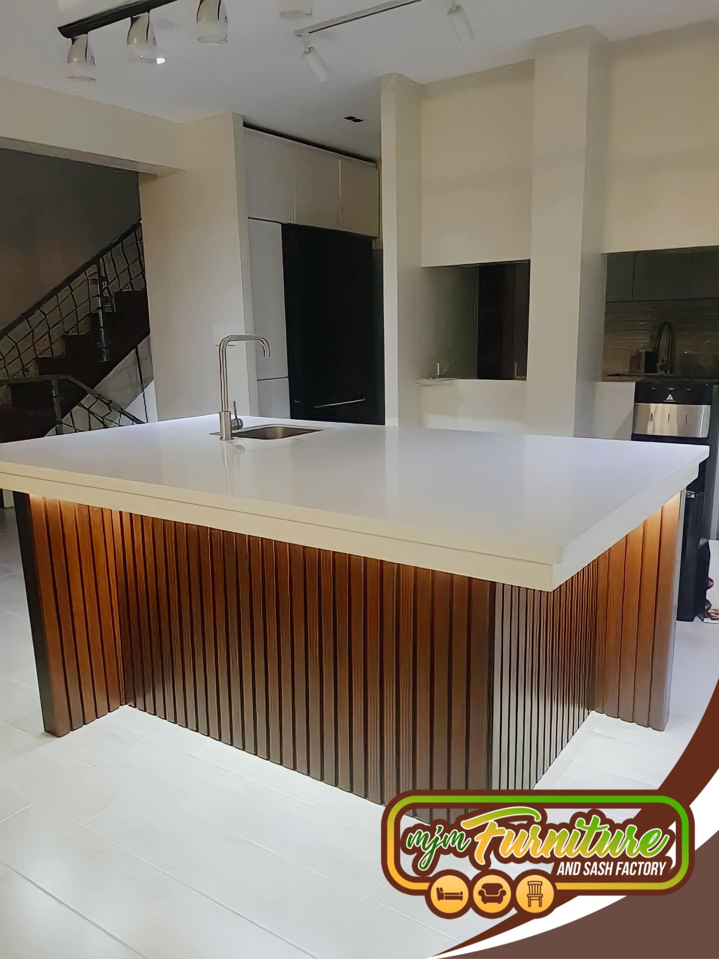 Make a stunning statement in your kitchen or entertaining area with this Contemporary Center Island, a showpiece designed for both high style and functionality. The island is defined by its dramatic base, featuring vertically-slatted, rich wood paneling with a deep, glossy finish that creates a textured, wave-like aesthetic.